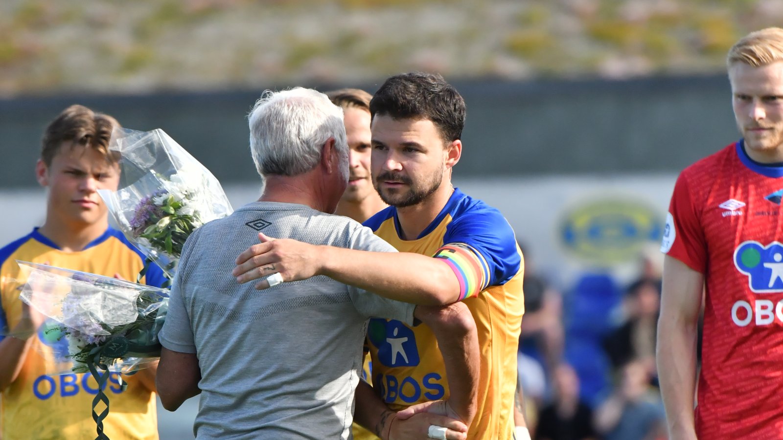 Før kampen fikk han overrakt en blomsterhilsen fra styreleder Richard Pedersen.