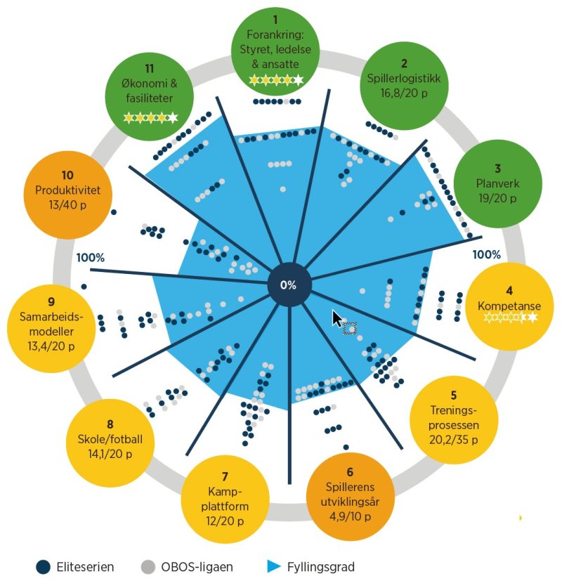 Fyllingsgraden på det blå sektordiagrammet representerer gjennomsnittet på hvert av de 10 områdene.