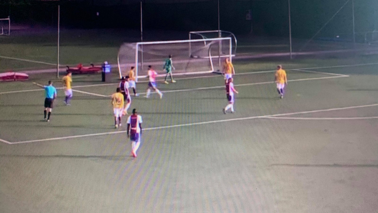 KFUM har en i tverrleggeren, men dommeren blåste korrekt for offside.