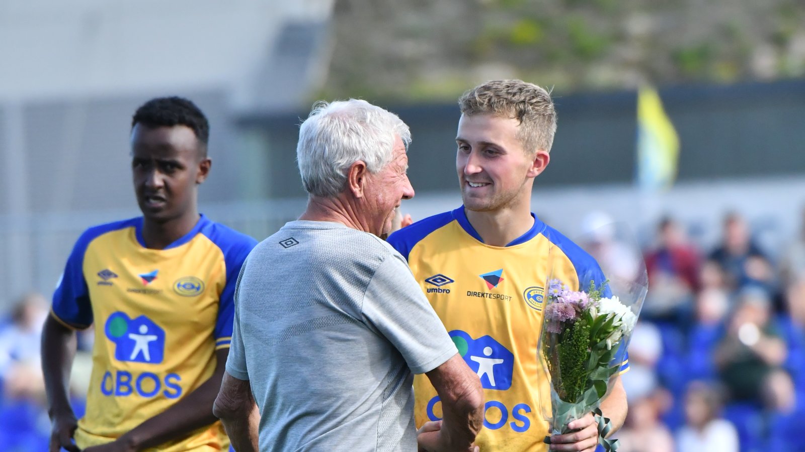 Fabian Østigård Ness nådde tresifret antall obligatoriske kamper for Grorud mot Skeid, og før kampen mot Sandnes Ulf fikk han overrakt en blomsterhilsen fra styreleder Richard Pedersen.