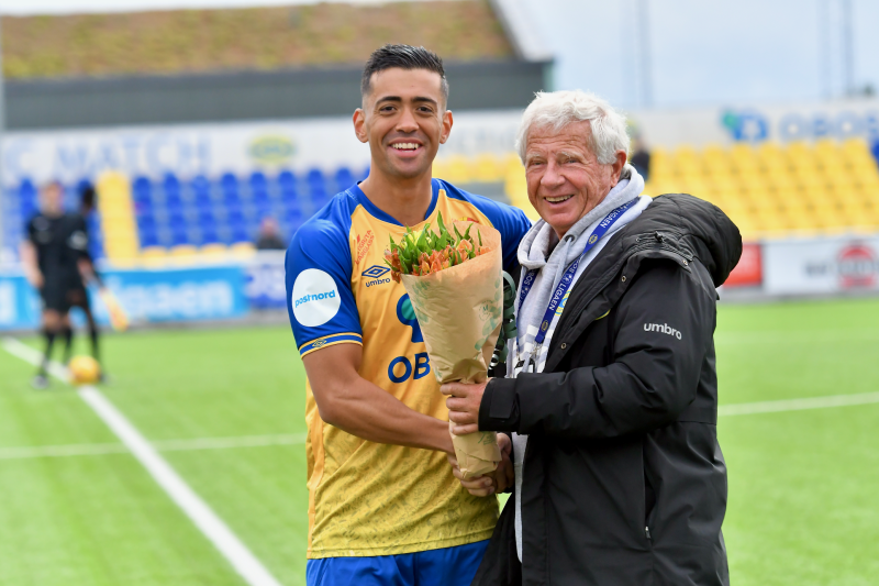 Mohammed Mahnin spilte sin 100. obligatoriske kamp for Grorud, og fikk fortjente blomster av styreleder Richard Pedersen.